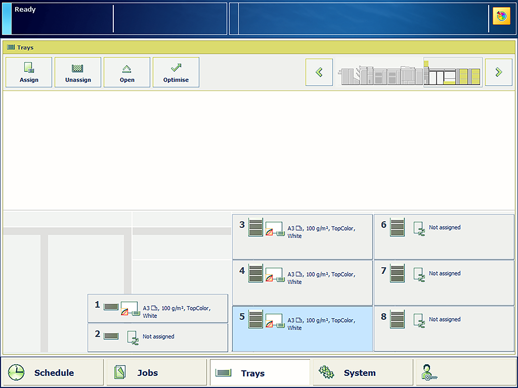 po prawej stronie panelu sterowania, aby sprawdzić, czy nośniki znajdują się na tacach. Po załadowaniu nośników na tace na papier należy przypisać nośniki w widoku Tace. Jeśli rodzaj nośnika w tacy na papier nie zmienia się, nie ma potrzeby przypisywania nośników po załadowaniu.