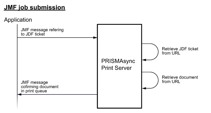 The application sends a JMF message to the PRISMAsync Print Server. This message contains a URL to the JDF ticket, for example:
