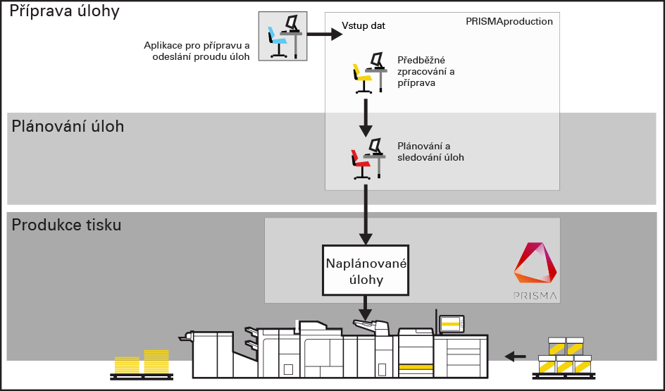 Postup zpracování úloh pro režim transakčního tiskuV každodenní práci můžete přecházet mezi režimy transakčního tisku a tisku dokumentů bez restartování systému tisku.