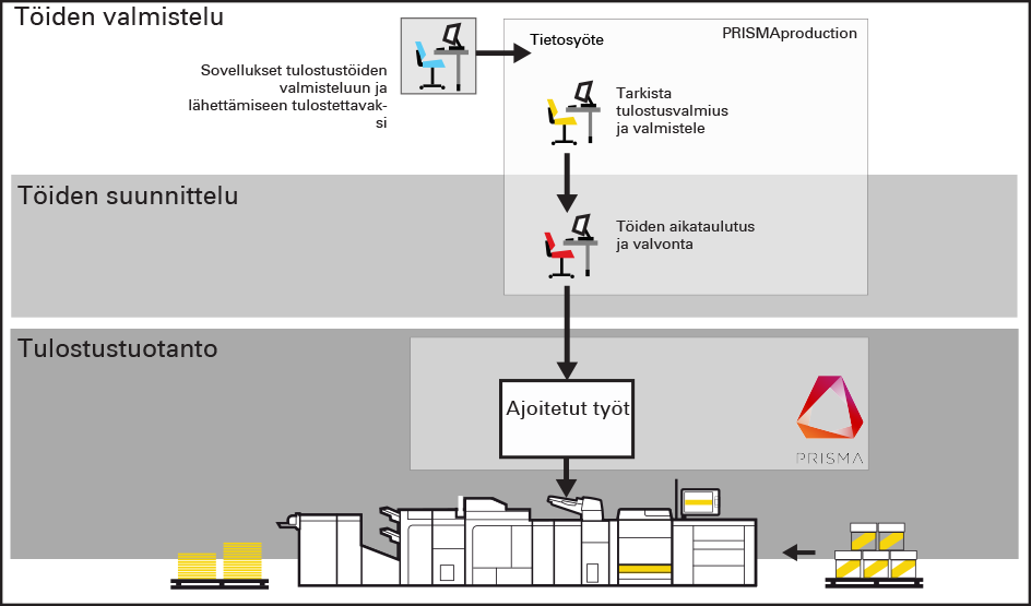 Voit määrittää työn sisältämän paperilokeron numeron fyysiseen paperilokeroon. Voit valita materiaalin materiaaliluettelosta ja linkittää ne loogiseen lokeroon, joka on ilmaistu numerolla. Tulostusjärjestelmä yhdistää loogiseen lokeroon määritetyn materiaalin fyysisiin paperilokeroihin, joissa materiaali on. Ohjauspaneelista näkee, mitä materiaalia työssä käytetään.
