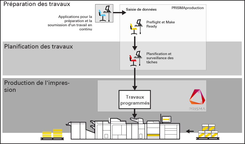 Cycle de traitement des travaux du mode d'impression de transactionPour vos tâches quotidiennes, vous pouvez basculer entre les modes d'impression de transaction et d'impression de documents, sans devoir redémarrer le système d'impression.