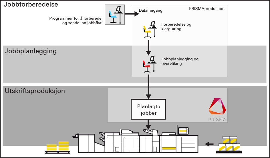 Hvis det finnes en lisens for transaksjonsutskrift (IPDS eller PCL), kan du bruke utskriftssystemet i transaksjonsutskriftsmodus. En IPDS- eller PCL-vert sender en overføringsjobb til en dedikert port for utskriftssystemet. Transaksjonsutskriftsmodusen passer for utskriftsmiljøer med store mengder forretningskritiske data, for eksempel fakturaer, sjekker og lønnsslipper.