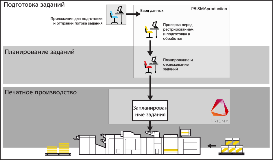 Рабочий процесс для режима транзакционной печатиПри ежедневной работе можно переключаться между режимами транзакционной печати и печати документов без перезагрузки печатной системы.