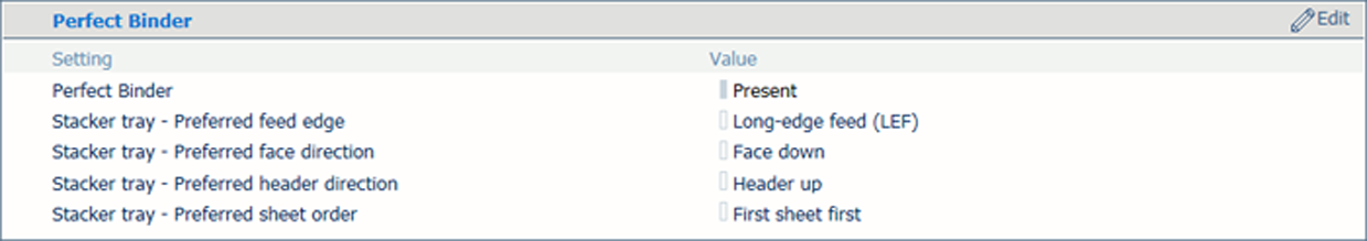 [Perfect Binder] sectionUse the [Stacker tray - Preferred feed edge] setting to define the feed direction of the sheets on the output tray.