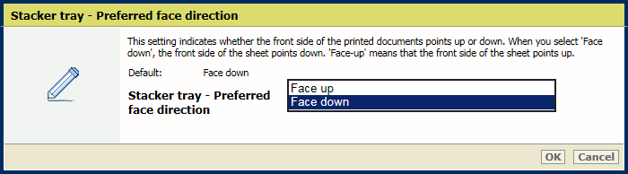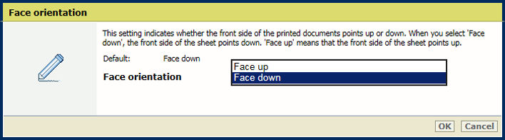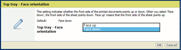 Default feed directionUse the [Top tray - Face orientation] and [Stack tray - Face orientation] settings to indicate if the front side of the prints points up or down by default.