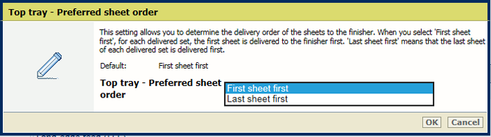 [Header orientation] settingUse the [Preferred sheet order] setting to define the default order of the printed sheets within a job.
