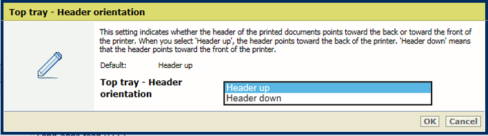 Preferred face direction settingUse the [Upper tray - Preferred header direction], [Lower tray - Preferred header direction] or [Booklet tray - Preferred header direction] setting to indicate if the header points to the front side of the printer or to the back side of the printer by default.