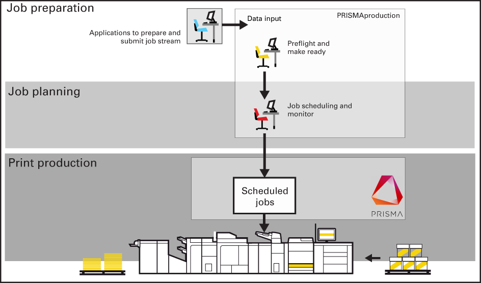Transaction print jobsThe following illustration shows the transaction print job workflow from job preparation to the delivery of the prints. The output and workflow management application PRISMAproduction provides a single point of control to spool, manage and monitor transaction print jobs.