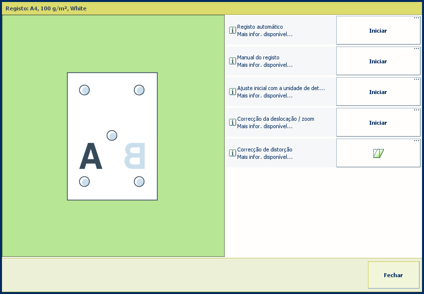 O sistema de impressão posiciona as imagens frontais e posteriores com precisão nos dois lados da folha durante o processo de impressão. Apesar de se esperar que o registo de materiais do sistema de impressão esteja globalmente à altura das expectativas do operador, pode ajustar os valores de registo de materiais caso detete desvios.