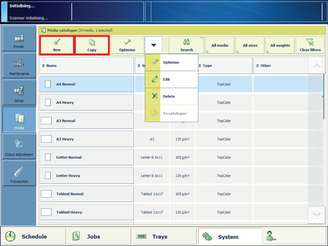 Når indstillingen er aktiveret i Settings Editor, kan du føje nye medier til mediekataloget via kontrolpanelet. Du kan også bestemme, om du ønsker mediefamiliens kalibreringsadvarsler og advarsler om manglende medieattributter i kontrolpanelet.