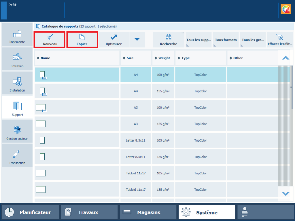 Lorsqu'ils sont activés dans Settings Editor, vous pouvez ajouter de nouveaux supports dans le catalogue de supports via le panneau de commande. Vous pouvez également définir si vous souhaitez des avertissements sur le calibrage de la famille de supports et des avertissements sur les attributs de supports manquants sur le panneau de commande.