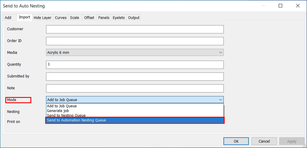 • An Automatisierungsmodus für Nesting-Warteschlange senden (bei Auto-Nesting)