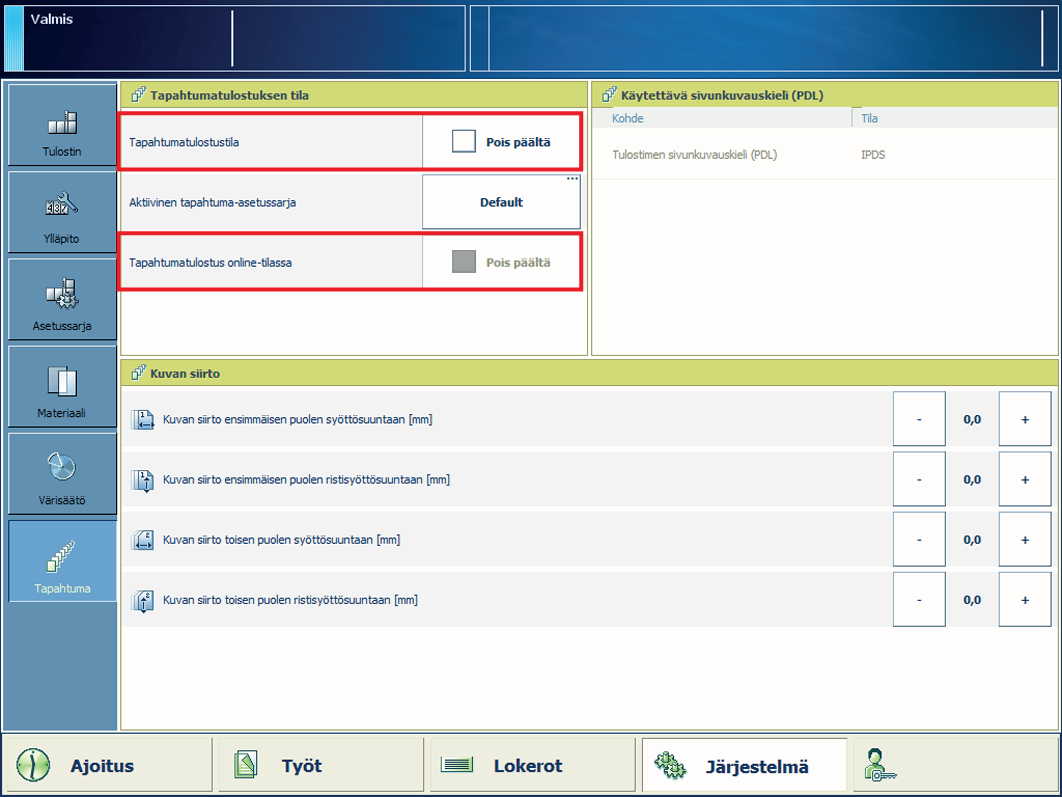 Jos tapahtumatulostustila on aktiivinen ja haluat siirtyä asiakirjojen tulostustilaan, noudata seuraavia ohjeita. Jos asiakirjojen tulostustila on käytössä, tulostin ei voi ottaa vastaan tapahtumatulostustöitä.