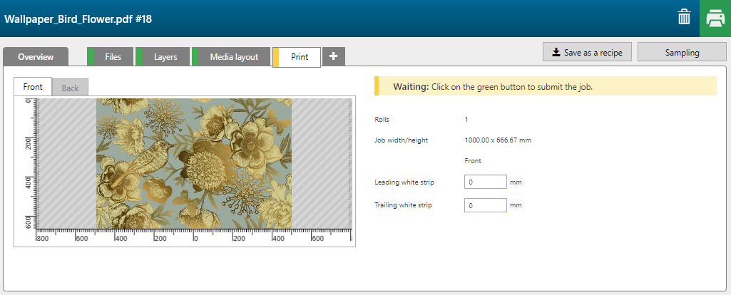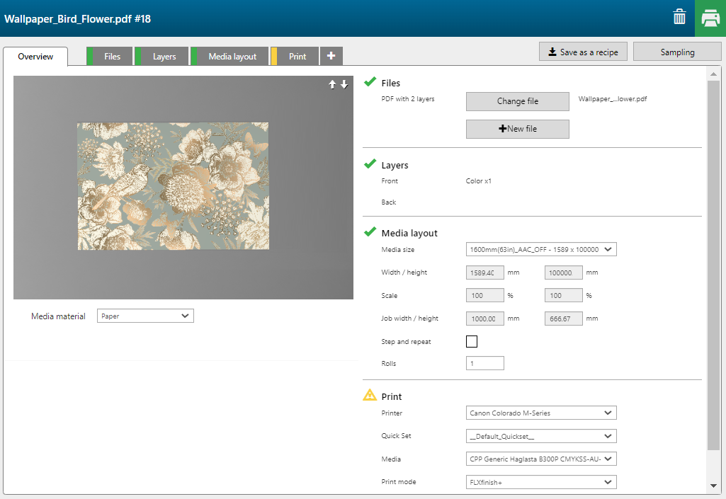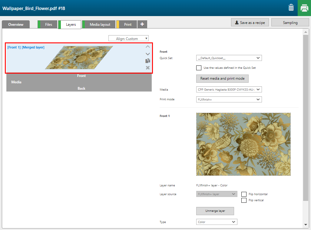 Con la fórmula [Capas FLXfinish+] puede imprimir un trabajo en parte en mate y en parte en brillo.