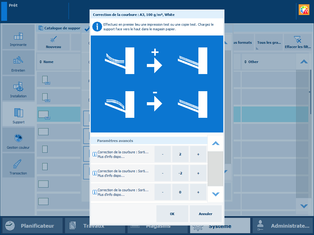 Les supports peuvent arriver gondolés dans le magasin de sortie, à cause des différences de température au cours du processus d'impression. Vous pouvez effectuer une procédure de correction, afin d'éviter que les feuilles soient gondolées dans les magasins de sortie. Les résultats de la correction prennent immédiatement effet pour les travaux qui utilisent ce type de support.