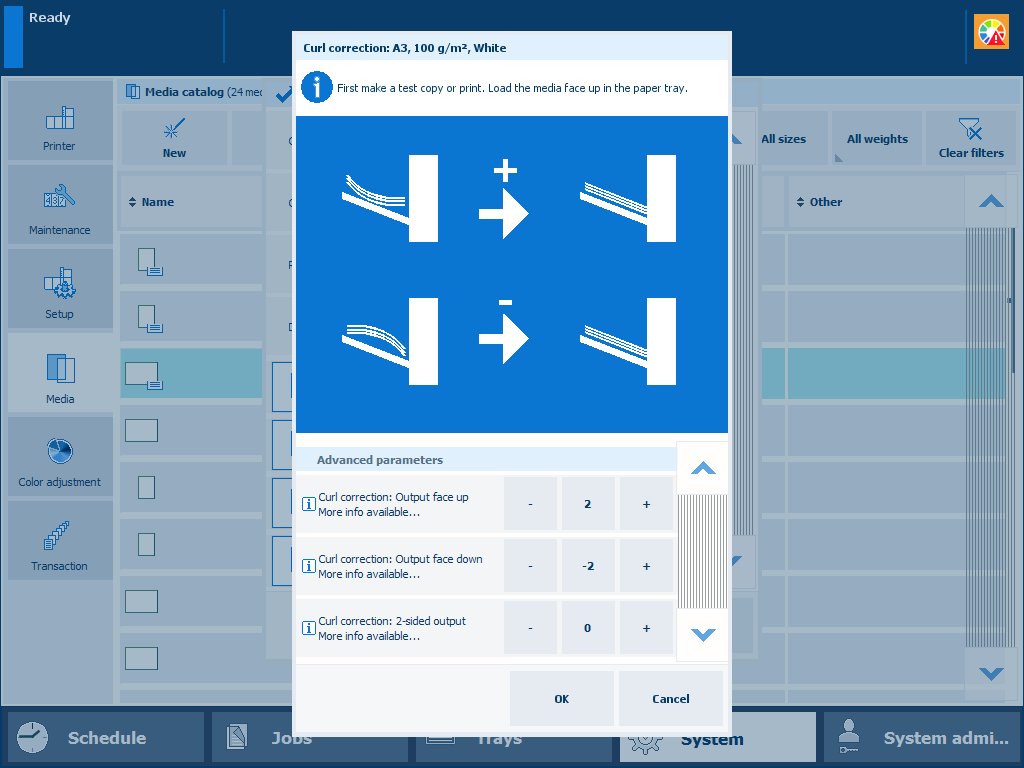 Media can arrive curled in the output tray. This is caused by temperature differences during the print process. You can perform a correction procedure to prevent curled sheets in the output trays. The results of the correction are immediately effective for jobs that use these media.