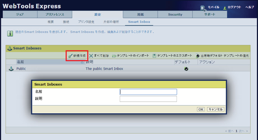 Smart Inbox はプリント元、スキャン先、または保存先の個人用フォルダとして使用します。「WebTools Express」では、次の場所で Smart Inbox を作成できます。