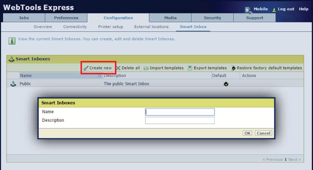 A Smart Inbox is used as a personal folder to print files from, scan files to, or store files in. In WebTools Express you can create a Smart Inbox in: