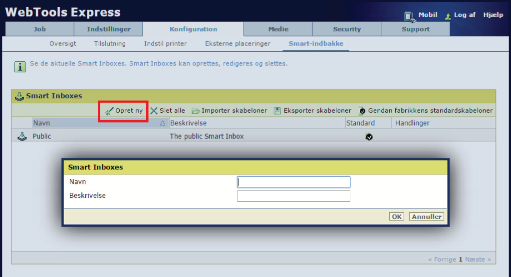 En Smart Inbox anvendes som en personlig mappe til at udskrive filer fra, scanne filer til eller gemme filer i. I WebTools Express kan man oprette en Smart Inbox i: