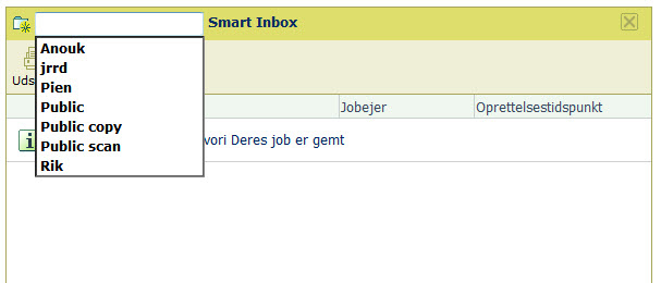 De Smart Inboxes, der er oprettet i sektionen Smart Inbox, er, når de er tomme, kun synlige i den personlige browser. Når der er et job i den specifikke Smart Inbox, bliver denne Smart Inbox også synlig i brugerpanelet og i andre browsersessioner.