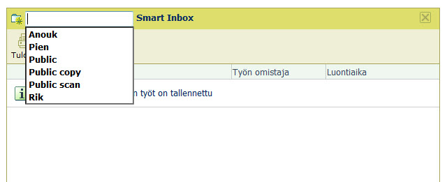 Napsauta osassa [Työnkulku] kenttää Smart Inbox. Näytölle avautuu niiden Smart Inboxesien pudotusvalikko, jotka sisältävät yhden tai useampia töitä. |