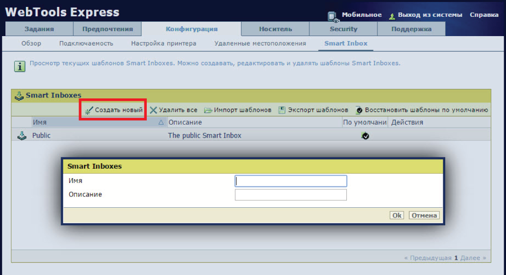 Smart Inbox используется в качестве личной папки, из которой выполняется печать файлов, в которую сканируются или сохраняются файлы. В WebTools Express можно создать Smart Inbox в следующих расположениях: