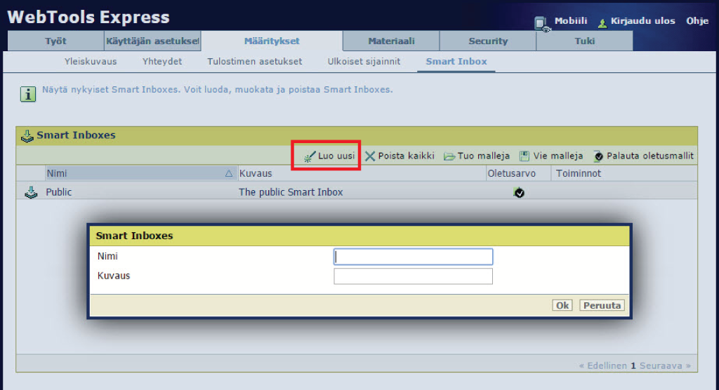 Smart Inboxia käytetään henkilökohtaisena kansiona, josta voi tulostaa tiedostoja, johon voi skannata tiedostoja tai tallentaa tiedostoja. WebTools Express -sovelluksessa voit luoda Smart Inboxin kohdassa: