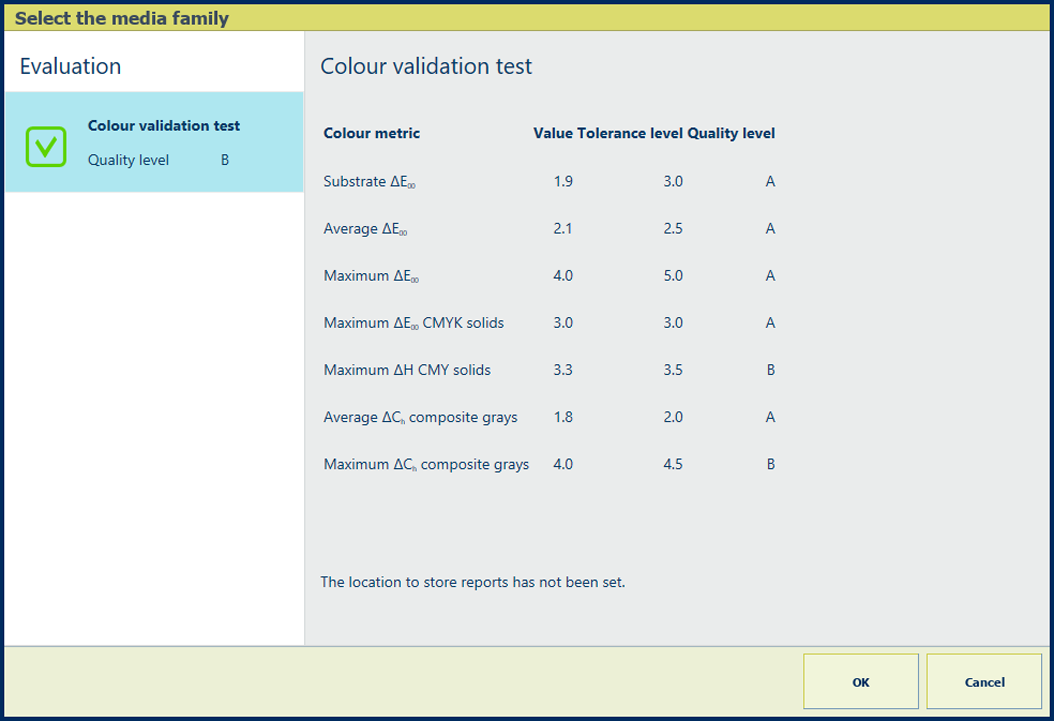 Ocena testu kolorów Test pokazuje zmierzoną wartość, poziom tolerancji oraz przypisany poziom jakości.