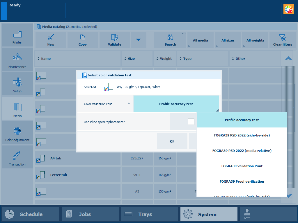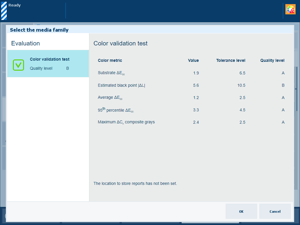 The [Color validation test] information of the pre-defined profile accuracy test indicates if a media fits the media family. The test also indicates how accurate colors are reproduced on the used media with corresponding output profile.