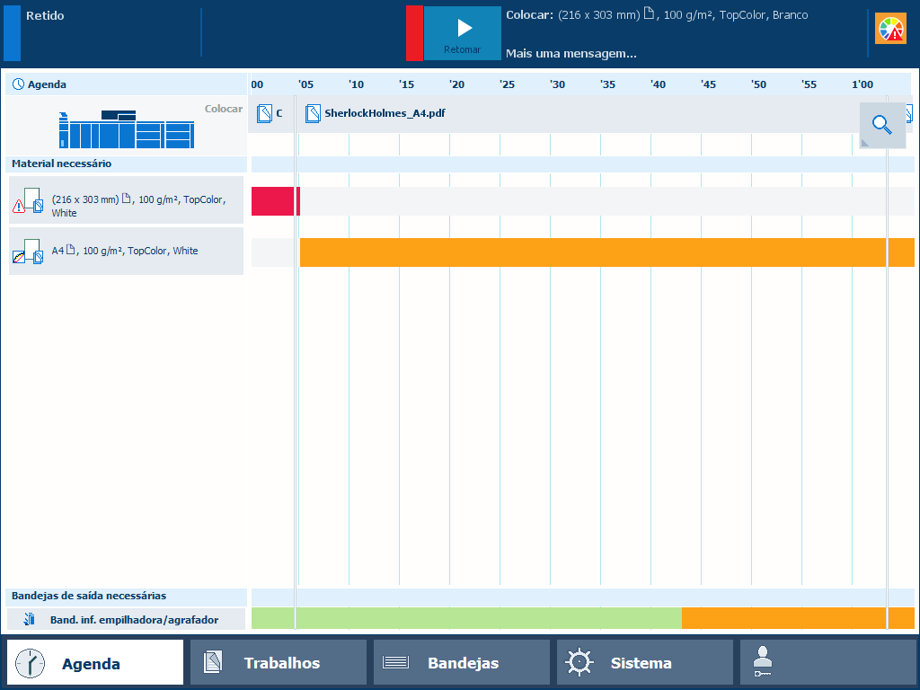 A agenda é o painel de planificação com um máximo de oito horas diárias do painel de controlo e do PRISMAremote Manager / PRISMAsync Remote Manager Classic. A agenda indica a lista de trabalhos agendados e prevê o tempo de produção. Além disso, é possível ler os próximos eventos: carregamento das bandejas de papel ou remoção de impressões das bandejas de saída.