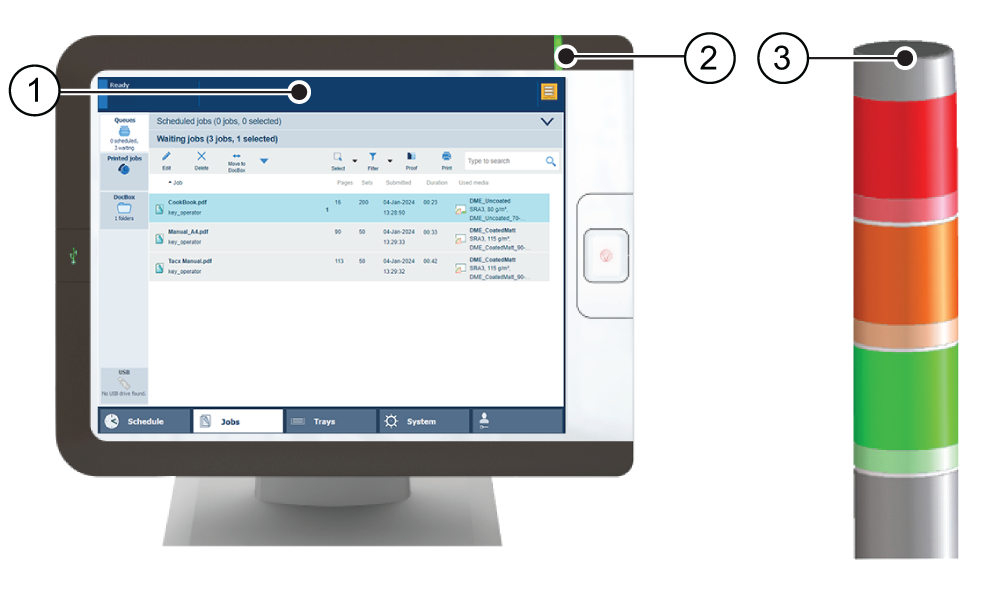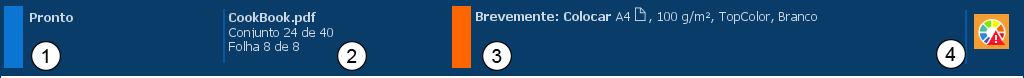 A consola, quando o sistema de impressão necessita que coloque o materialA consola mostra o estado da impressora (1), o nome e progresso do trabalho ativo ou do trabalho de transmissão em sequência (2), bem como mensagens (3) e ícones (4) das ações esperadas. Para evitar que a impressora pare, verifique regularmente os níveis de enchimento dos consumíveis e os resíduos.