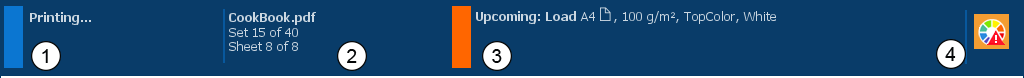 The dashboard when the print system needs you to load mediaThe dashboard shows the printer status (1), the name and progress of the active job or streaming job (2) as well as messages (3) and icons (4) of the expected actions. To prevent the printer from stopping, check the filling levels of supplies and waste on a regular basis.