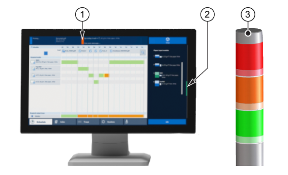 Status bar on the dashboard (1), the control panel (2) and the operator attention light (3)|