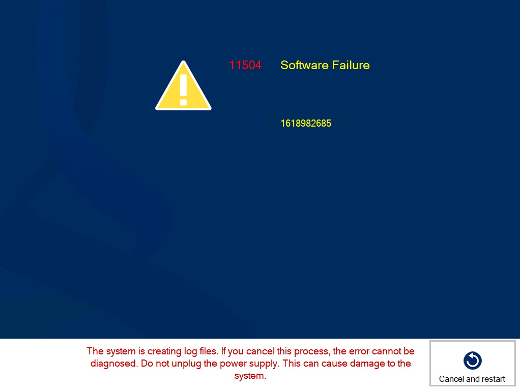 When a software failure occurs, the system automatically creates log files that contain all the crucial information for your service organisation to analyse and solve the problem. Creating the log files can take up to half an hour. It is possible that the log files were already created at the previous occurrence of the error. Therefore, you might not want to wait half an hour for the log files to be generated. You can cancel the creation of log files to reduce downtime of the printer.