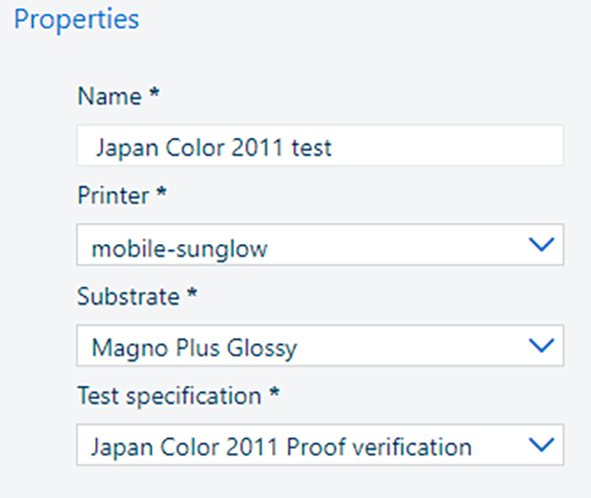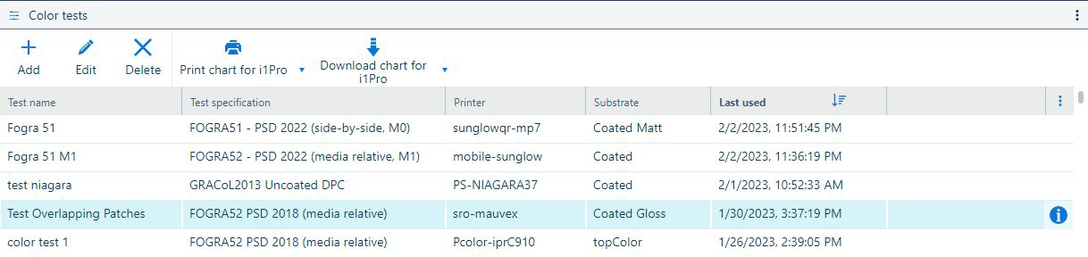 Med appen [Farvetest] kan du oprette farvevalideringstest, der er tilpasset en printer, et substrat og en testspecifikation. Den anden egenskab, substratet, henviser til det medie, der anvendes til at udskrive testdiagrammet på.