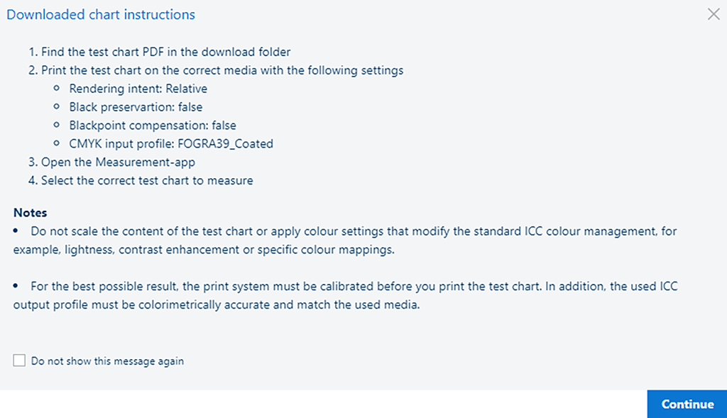 Testdiagrammet genereres, når du klikker på knappen [Hent diagram]. Når du klikker på knappen [Hent diagram], vises et nyt vindue med udskriftsinstruktioner. Du skal følge disse anvisninger, når du udskriver testdiagrammet.