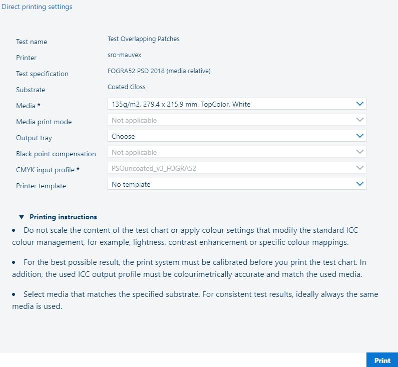Generiske udskriftsindstillinger er tilgængelige for testspecifikationseditoren i konfigurationsappen for at sikre, at der anvendes de samme udskrivningsbetingelser til hver testudskrivning.