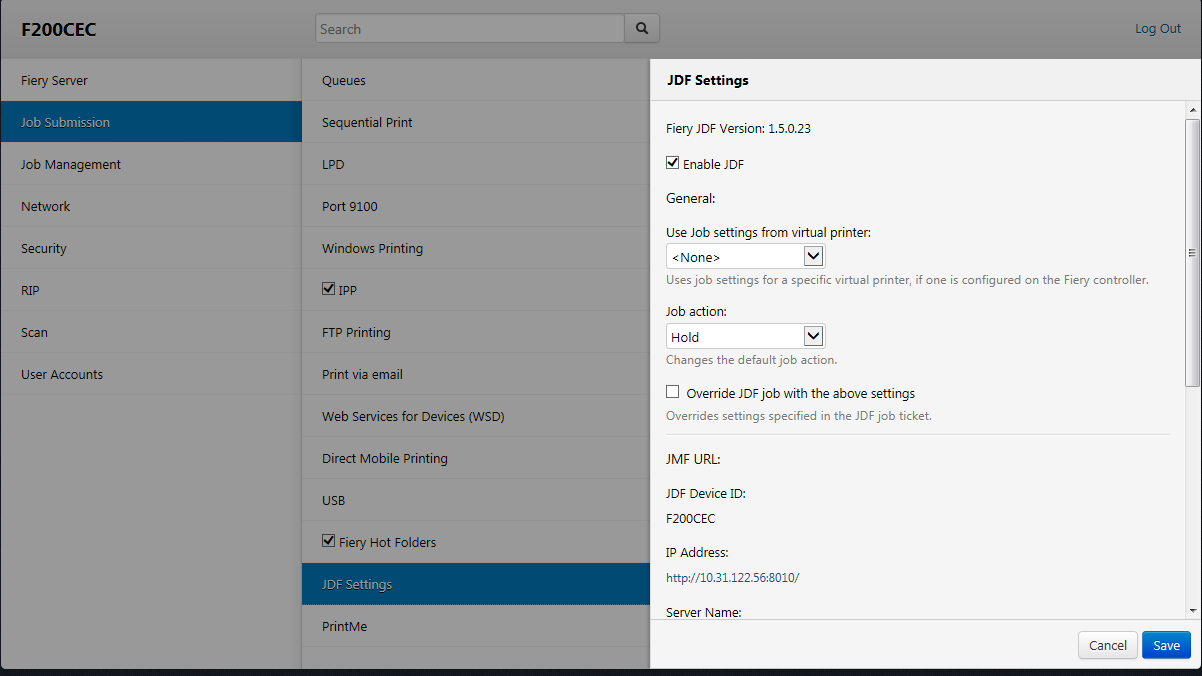 Du skal aktivere JDF-udskrivningsstien på Fiery-printserveren og konfigurere dens papirkatalog som JDF-baseret. Derefter kan PRISMAdirect sende PDF-filer med en JDF-jobseddel til Fiery-printserveren ved hjælp af JMF-netværksprotokollen.