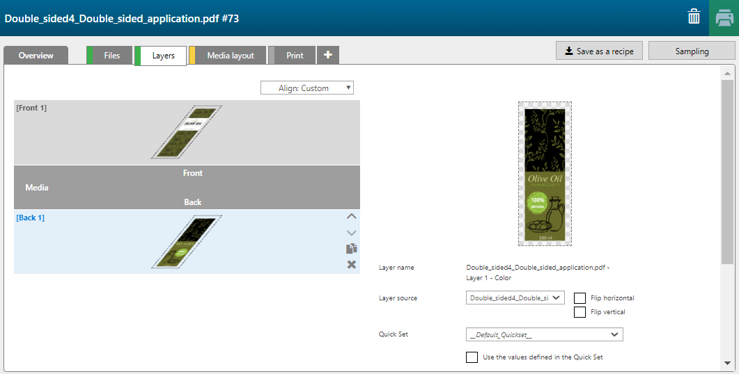 Crie um PDF utilizando uma fórmula no PRISMAguide XL Extensions. Para mais informações Ajuda do PRISMAguide XL Extensions. Neste exemplo criámos um PDF Double sided application com duas camadas, uma para a frente e outra para a parte de trás.