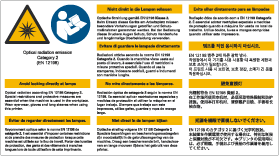 Varoitus: Optinen säteily. Lue käyttäjän dokumentaatio, kun suoritat tätä tehtävää tai toimintoa. Käännös: Vältä katsomasta suoraan lamppuihin. Optinen säteily standardin EN 12198 luokan 2 mukaan. Erityisrajoitukset ja suojatoimenpiteet ovat oleellisia, kun konetta käytetään työpaikalla. Käytä silmäsuojaimia, käsineitä ja pitkiä hihoja tätä tulostinta käyttäessäsi. Silmäsuojainten ja käsineiden tyypit kuvataan tässä asiakirjassa. |