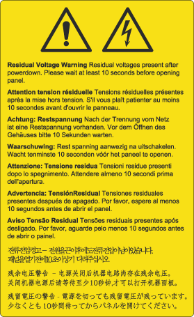 Varoitus: Sähkö. Jäännösjännitettä esiintyy virran poiskytkemisen tai verkkovirrasta irrottamisen jälkeen. Odota 10 sekuntia ennen paneelien tai kansien avaamista. Käännös: Jäännösjännitettä esiintyy virran poiskytkemisen jälkeen. Odota vähintään 10 sekuntia ennen paneelien avaamista |