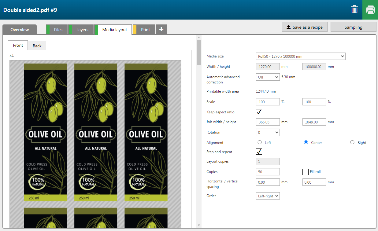 Die Anzahl der Rollen wird automatisch berechnet. Dies hängt von der Anzahl der Kopien und der Materialgröße ab. |