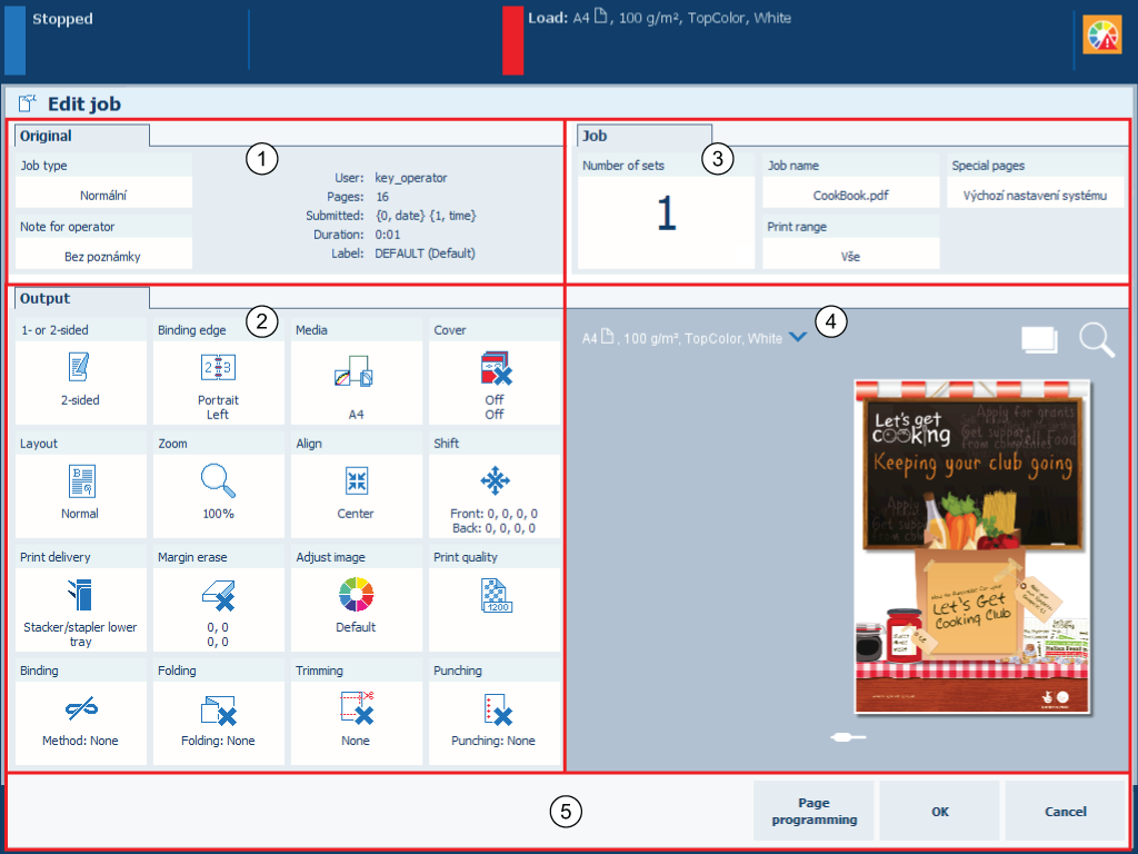 Job settings are usually made during the job preparation. You can decide to change the print job settings after you checked the first set of a print job, after a proof, or after you print a job ticket. You can change the settings remotely with PRISMAsync Remote Manager or locally on the control panel.