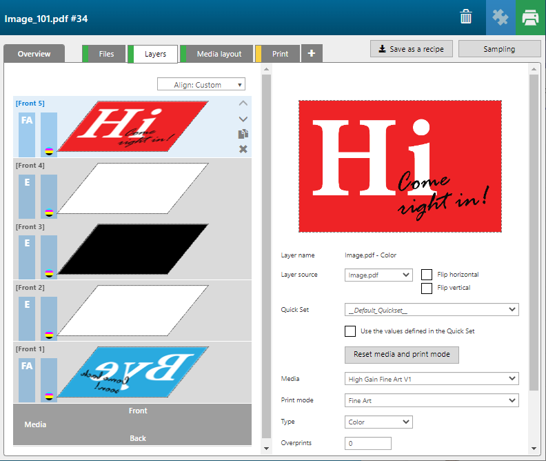 Überprüfen Sie die Druckeinstellungen für die einzelnen Layer. Wie in der Rezeptur festgelegt, weist das Anwendungsdesign 5 Layer auf, und alle Druckeinstellungen werden beibehalten (d. h. dieselben Materialprofile, Druckmodi, Layer-Typen, gesperrte Eingabedateien, usw.). Wie im Rezept festgelegt, werden das Bild für die Rückseite und die Blockout-Ebenen hinzugefügt.
