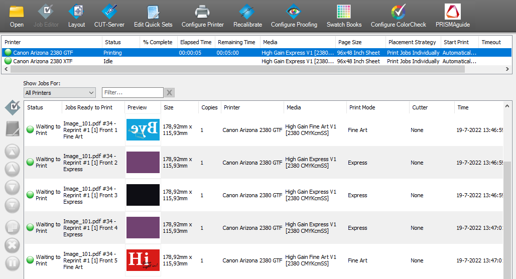 Die Reihenfolge der Druckaufträge in RIP Queue ist nicht von Bedeutung. In den Einstellungen für den Stapelauftrag ist festgelegt, in welcher Reihenfolge die Layer gedruckt werden sollen.