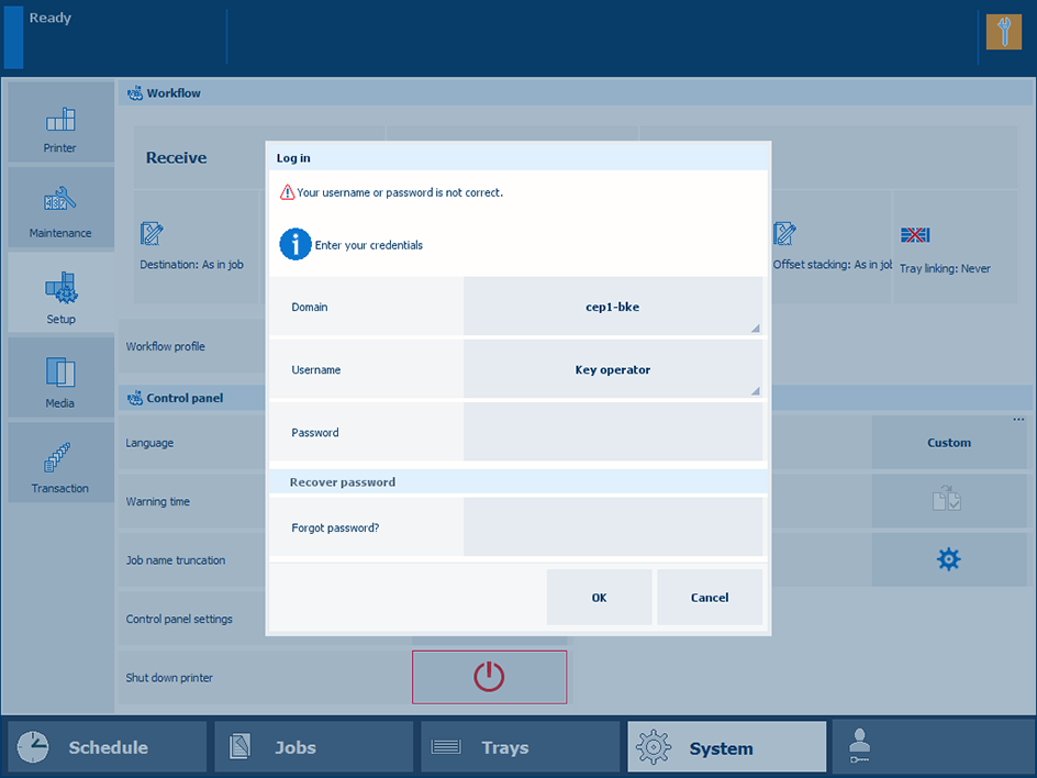 确保您的电子邮件地址是您的用户帐户属性的一部分。否则,必须在 PRISMAsync Print Server 用户帐户选项中更改密码。如果您没有权限更改 PRISMAsync Print Server 用户帐户选项,则需要向系统管理员提供密码。