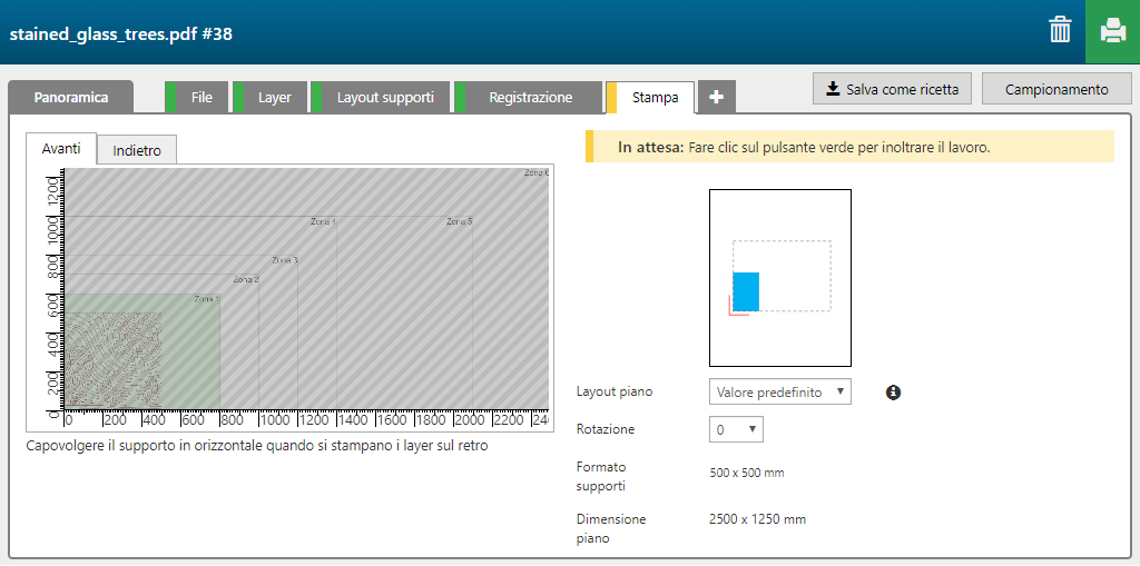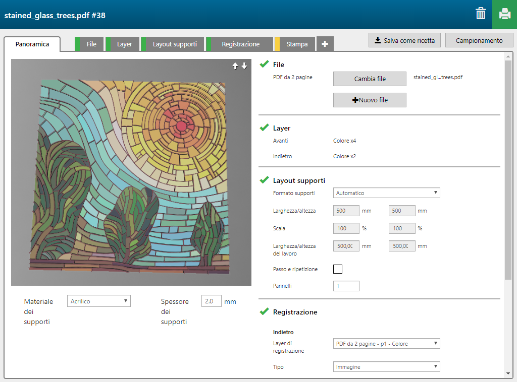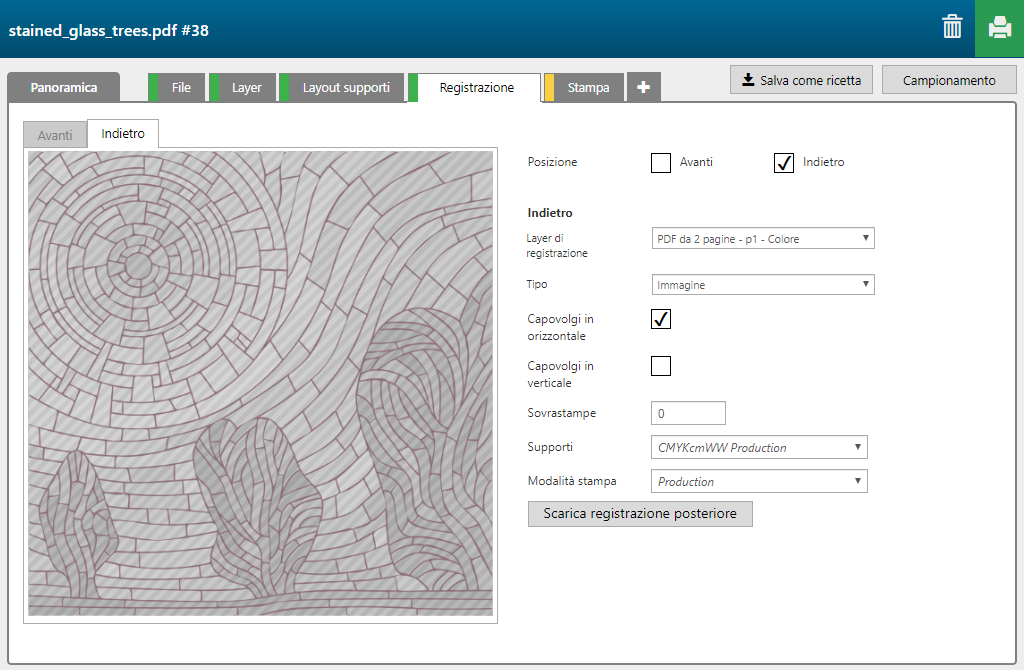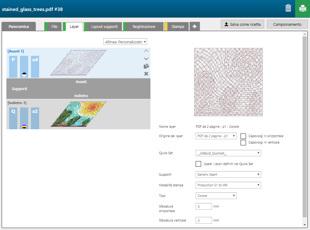La funzione 'Stained glass' contiene 6 layer, 4 stampato sul lato anteriore dei supporti, 2 stampati sul lato posteriore degli stessi.