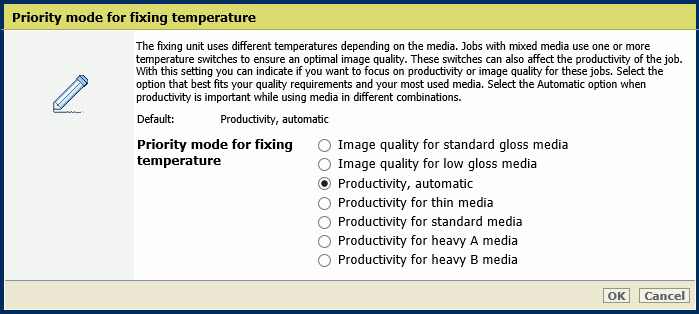 Utilize a definição [Modo de prioridade para temperatura de fixação] para indicar se pretende focar-se na produtividade ou na qualidade da imagem para trabalhos com material misto. Selecione o valor que melhor se adapta aos seus requisitos de qualidade e ao material mais utilizado.