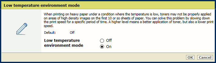 Włącz ustawienie [Tryb niskiej temperatury otoczenia] w celu polepszenia jakości druku zadań wykonywanych na ciężkim papierze, ale kosztem utraty szybkości drukowania.