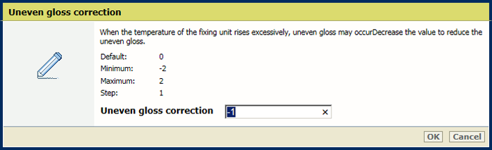 Ustawienie [Korekta nierównego połysku] Użyj opcji [Regulacja temperatury bębna] w celu dostosowania temperatury bębna. Zwiększ temperaturę bębna w celu usunięcia miejscowych zniekształceń lub cienkich białych linii powstałych w wyniku wysokiej temperatury lub dużej wilgotności otoczenia.
